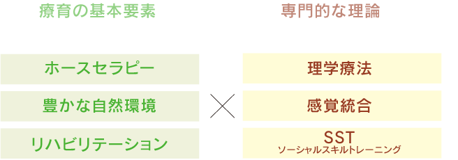 「ホースセラピー」「豊かな自然環境」「リハビリテーション」を療育の基本要素とし、理学療法・感覚統合・SST(ソーシャルスキルトレーニング)といった専門的な理論を用いて活動を行います。