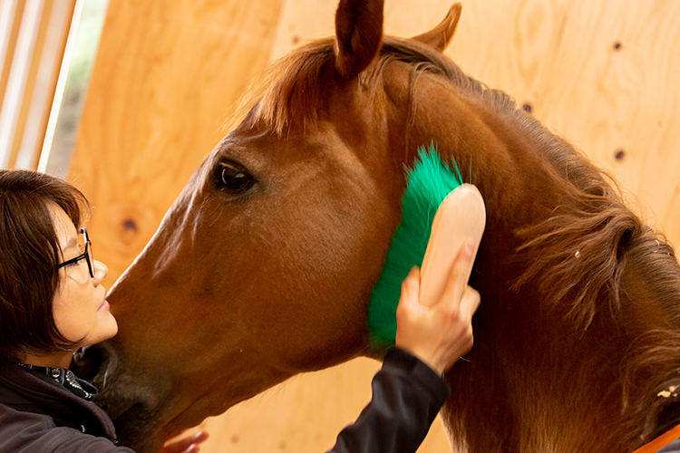 馬の体温と毛並みは情緒的な安定を図ることができるといわれています。ブラッシングは馬との大切なコミュニケーションの一つです。